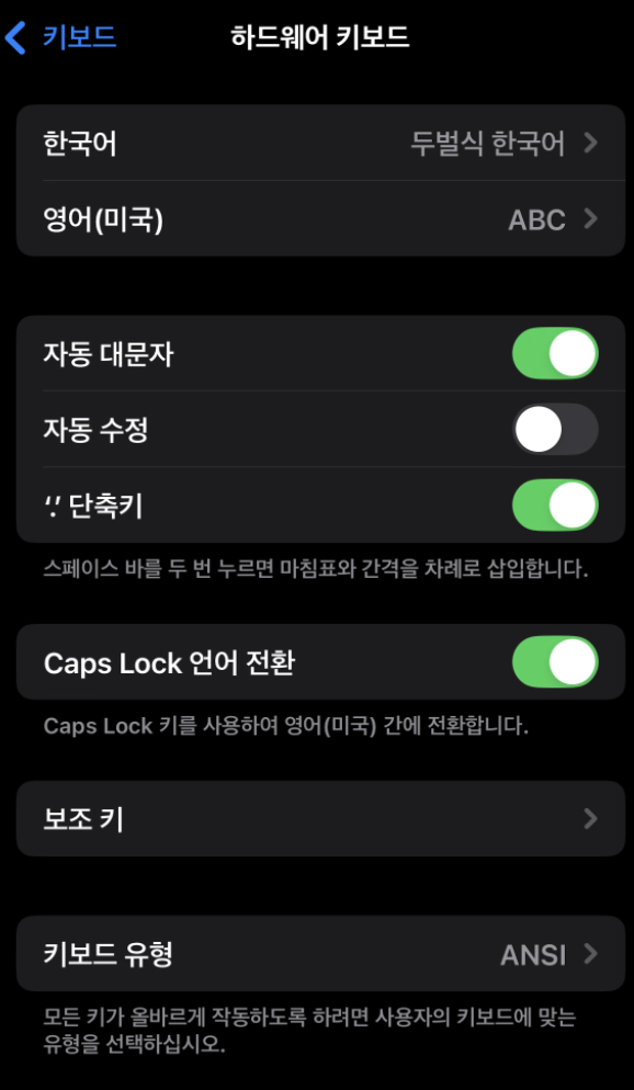 - 설정 > 키보드 > 하드웨어 키보드 에서