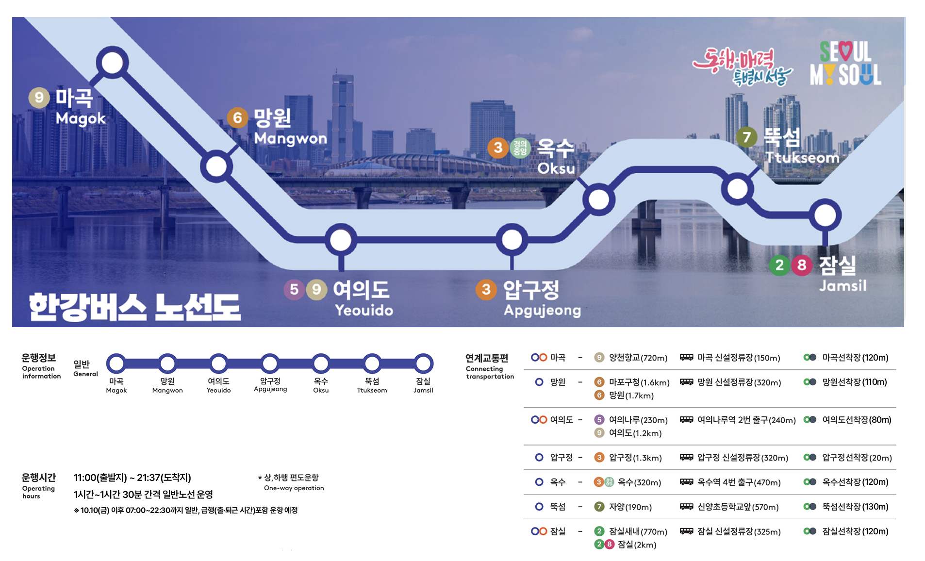 - 여의도 ↔ 잠실 ↔ 잠원 : 관광 및 환승 중심 노선