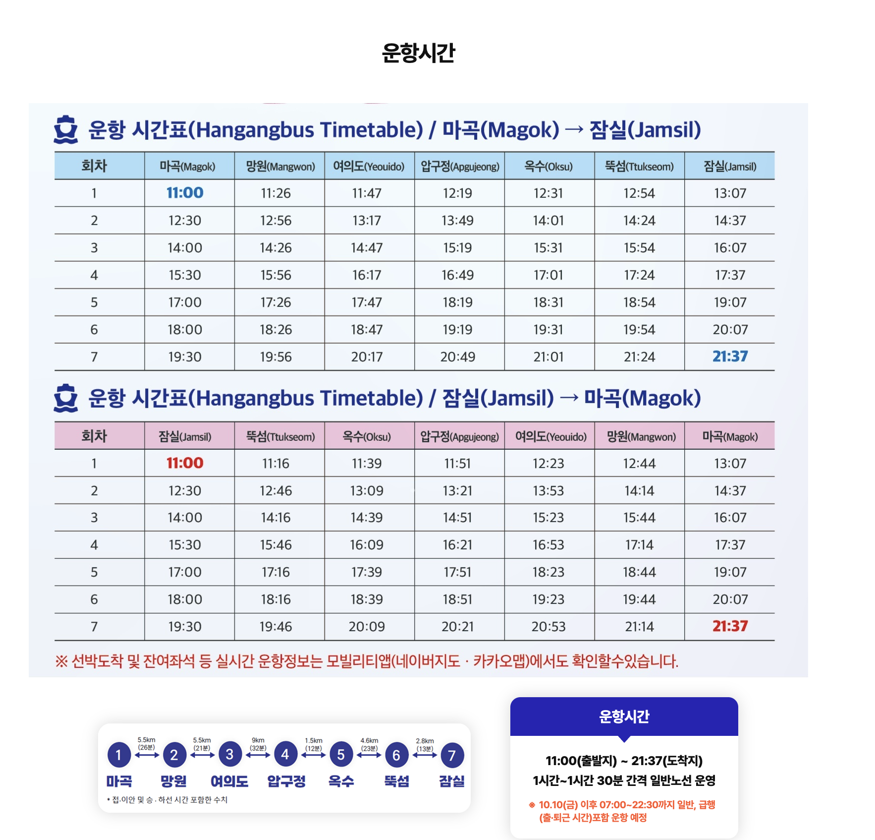 한강버스 일일 시간표도 꼼꼼히 체크해합니다. 시범 운행 기간(10월 9일까지)에는 오전 11시부터 밤 9시 반까지 한 시간 반 간격으로 운영되며, 이후 정식 운영(10월 10일 이후)부터는 출퇴근시간 급행이 포함되어 오전 7시부터 밤 10시 반까지 확대될 예정이에요. 실시간 승선 정보와 잔여석도 지도 앱으로 확인 가능하니 미리 챙겨보는 건 필수랍니다.