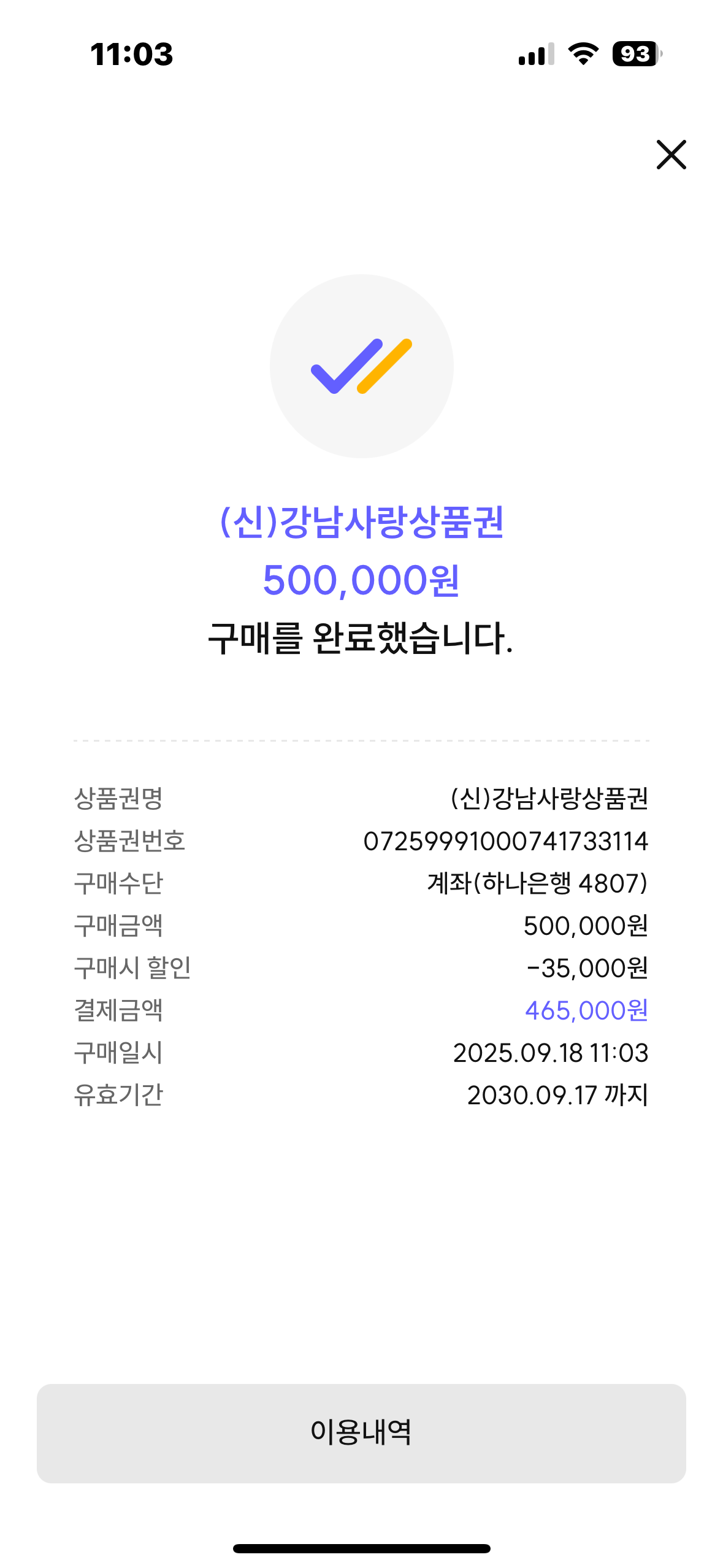 - 7% 할인: 10만 원 상품권을 9만 3천 원에 구매할 수 있어, 구매 즉시 7천 원의 할인 효과를 볼 수 있습니다.