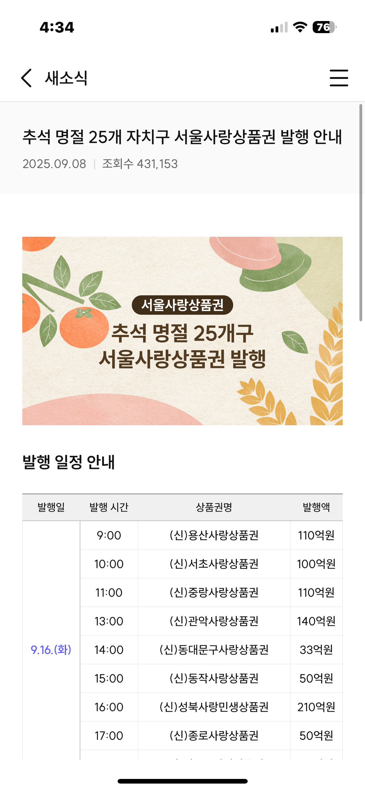 - 발행 규모: 이번 추석에는 총 2,755억 원 규모의 상품권이 25개 자치구별로 순차적으로 발행됩니다. 이미 발행이 시작되었거나 곧 시작될 예정이니, 각 자치구의 발행 일정을 확인하여 서둘러 구매하는 것이 좋습니다.